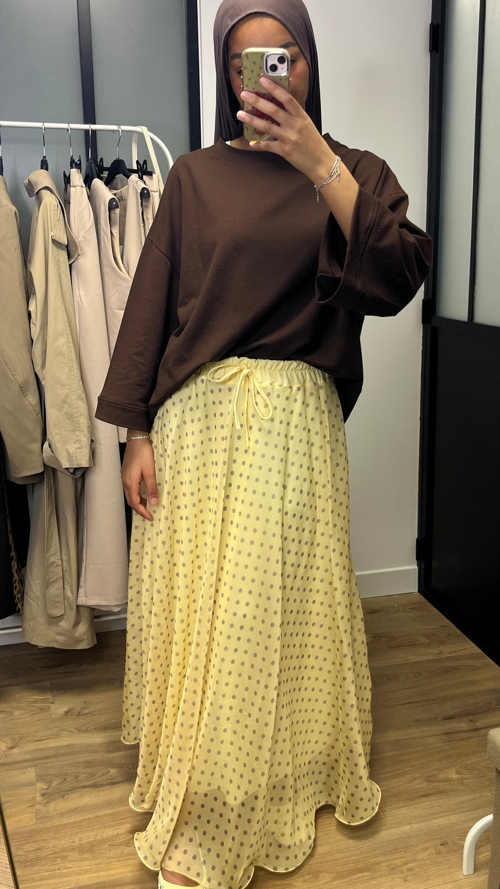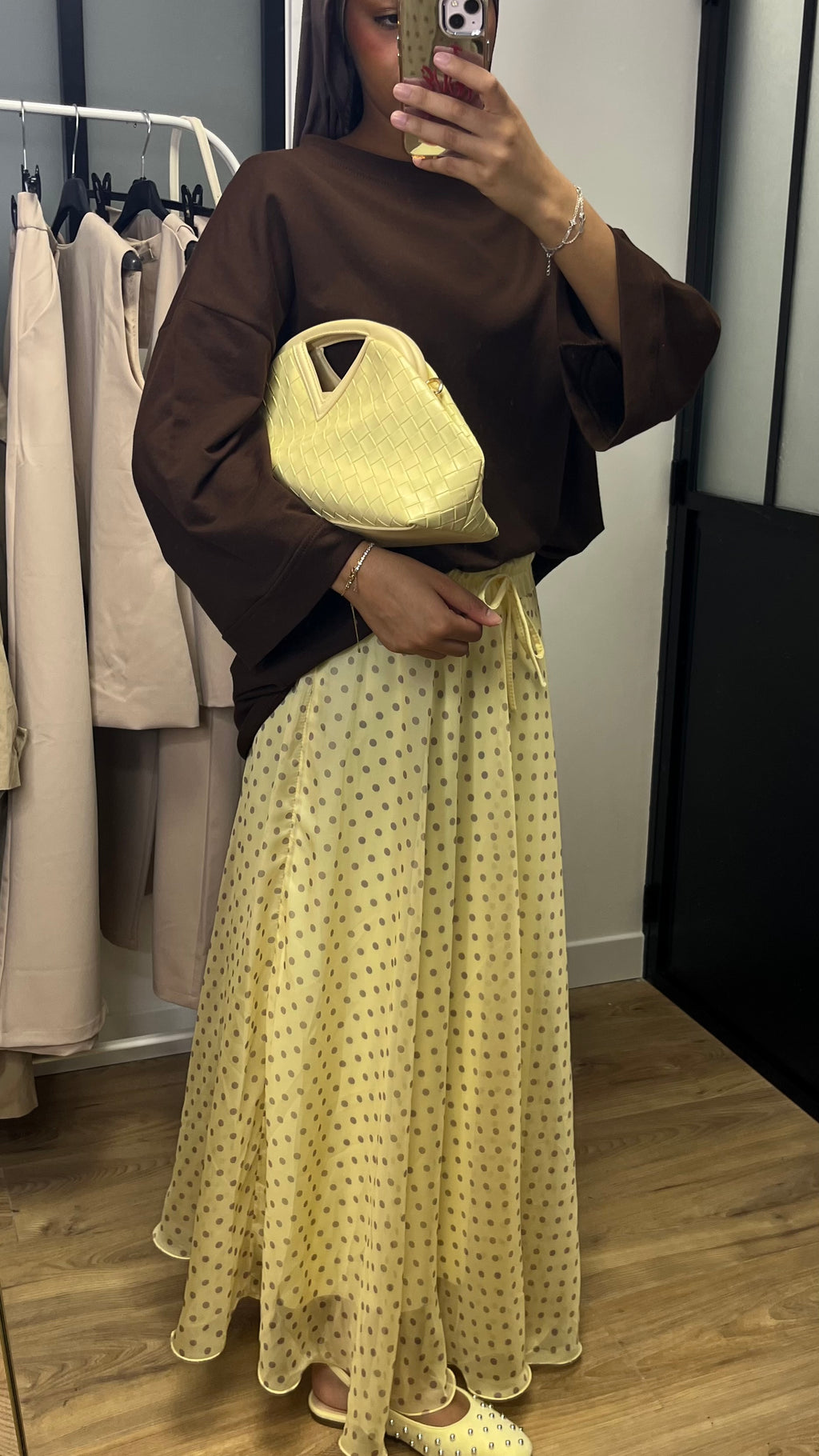 Le modèle porte une taille unique – elle mesure 1m71. Convient d’un 36 à un 42.