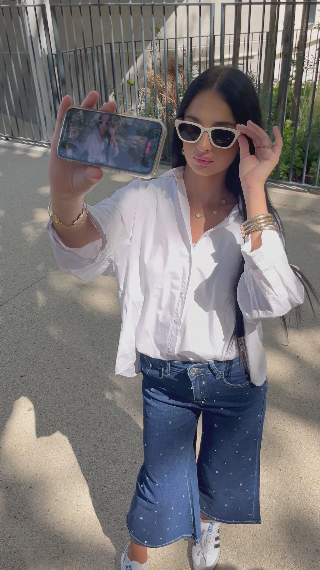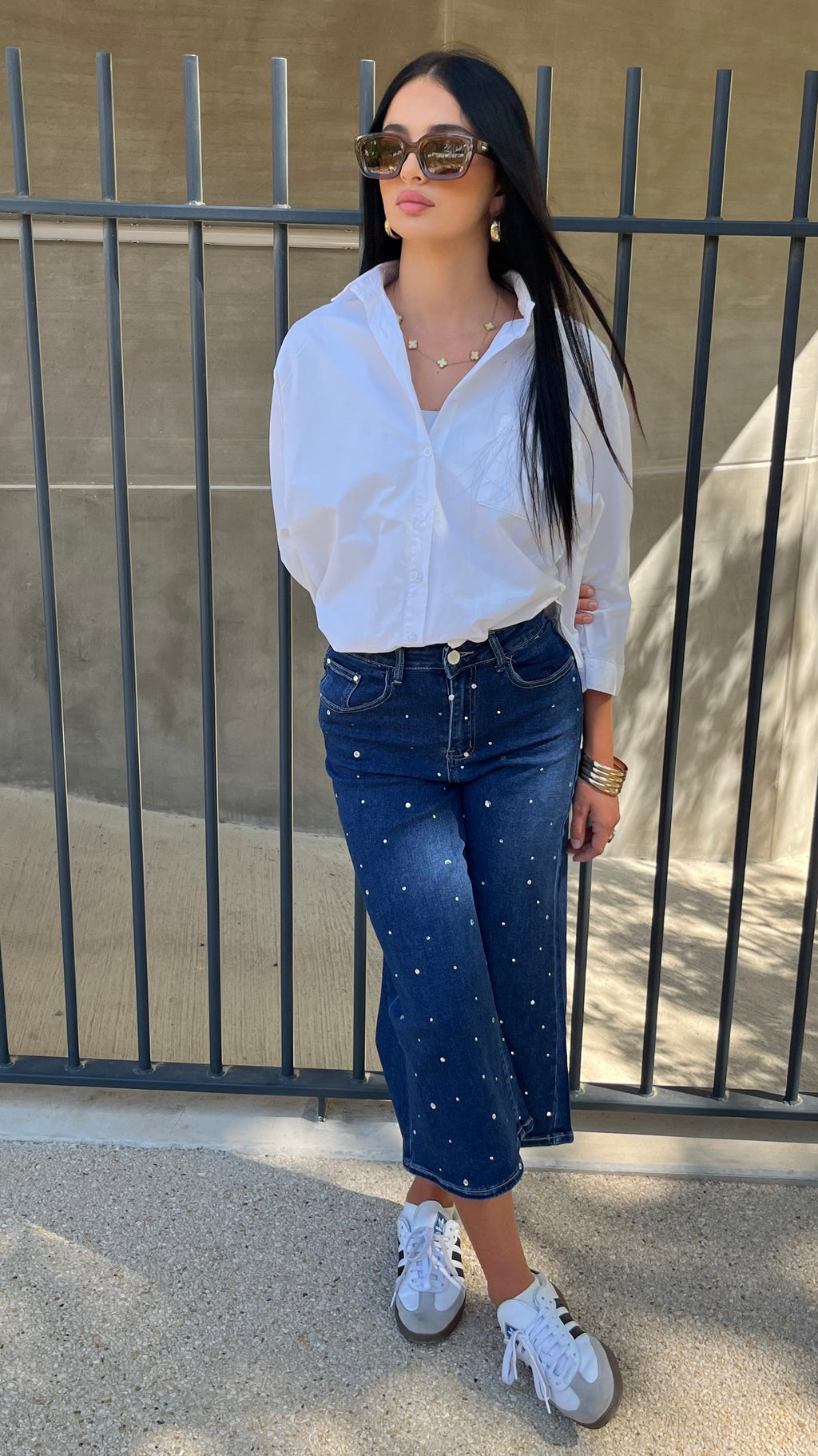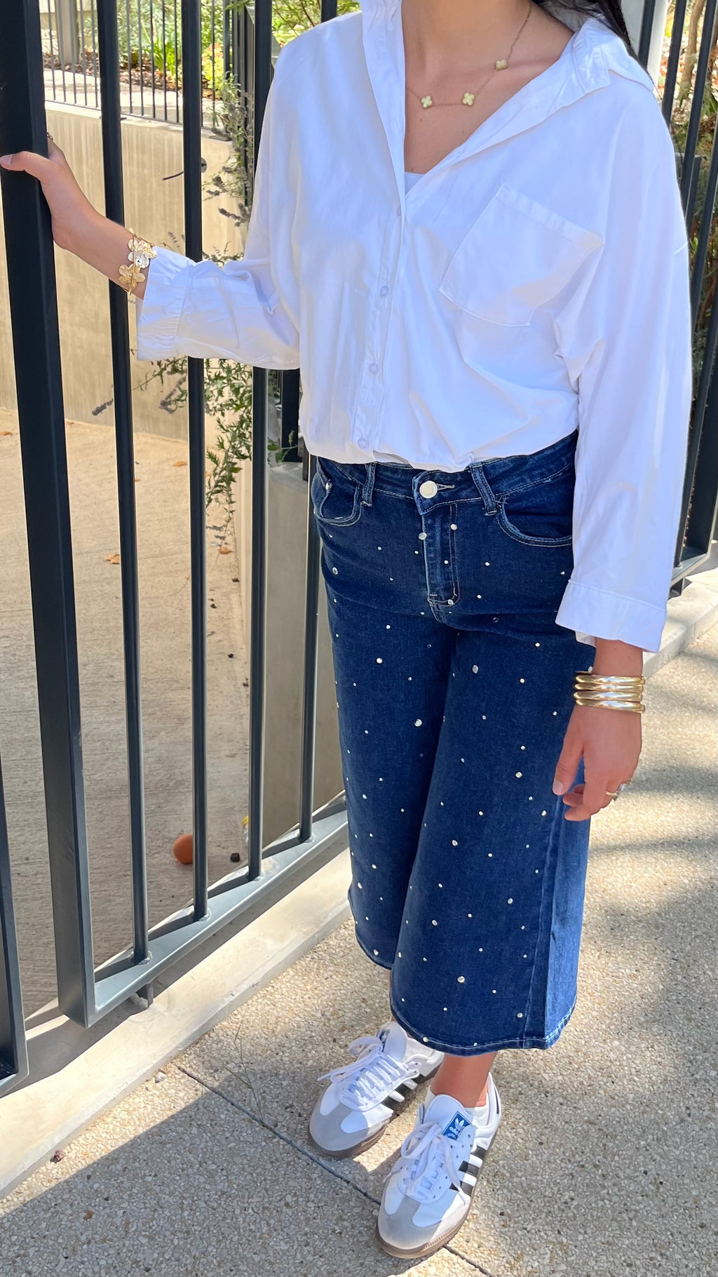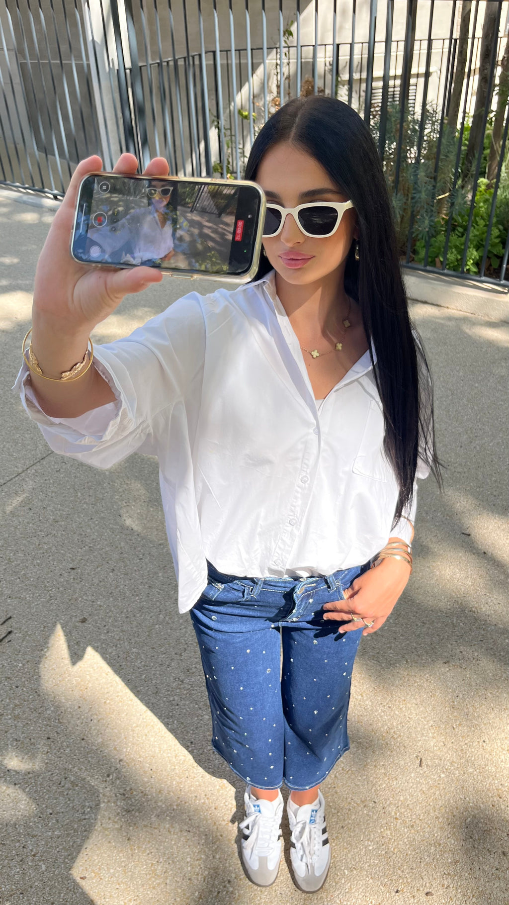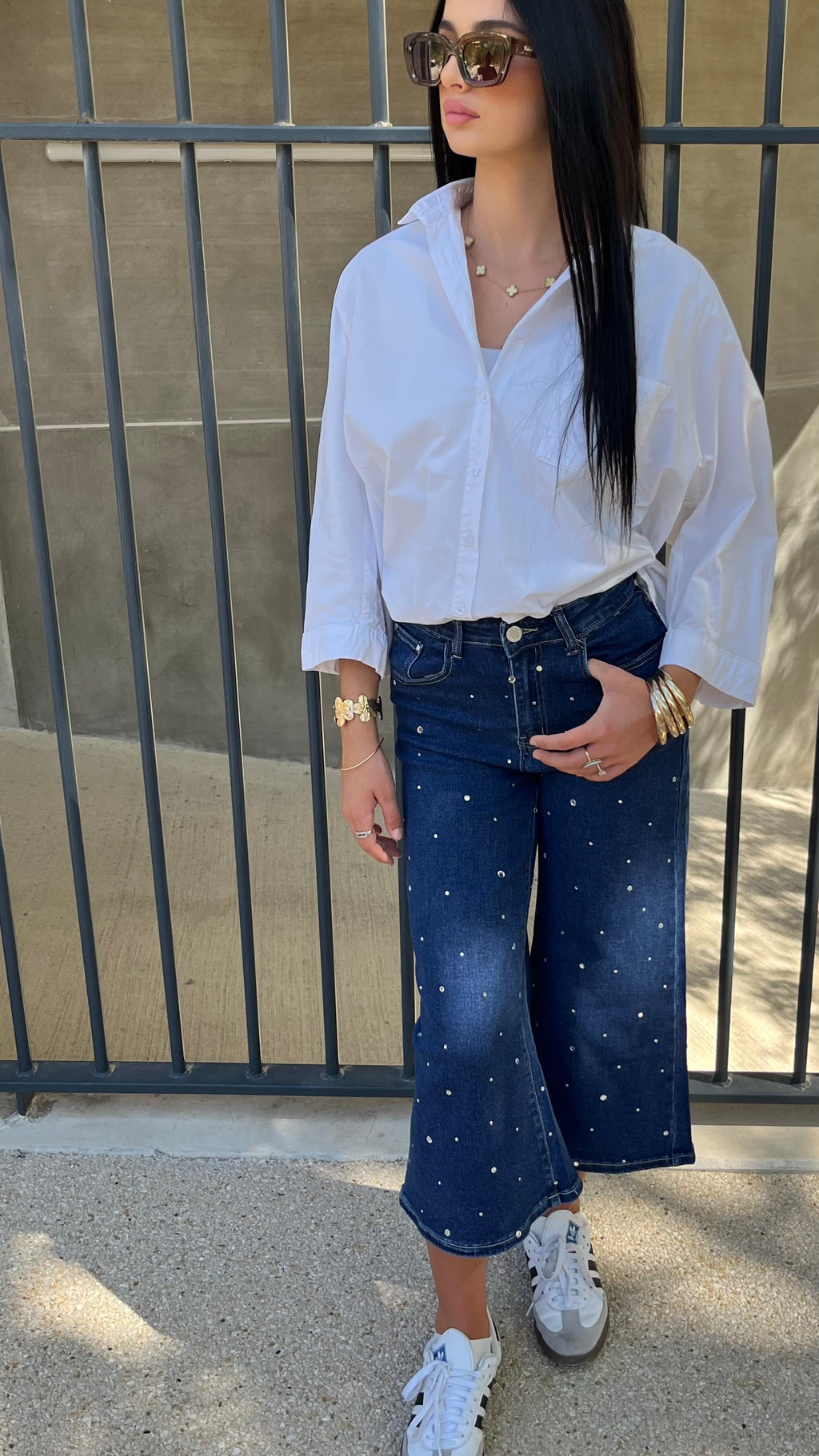 Jean coupe 3/4 décoré de strass ton argenté sur toute la longueur. Taille haute avec fermeture classique.