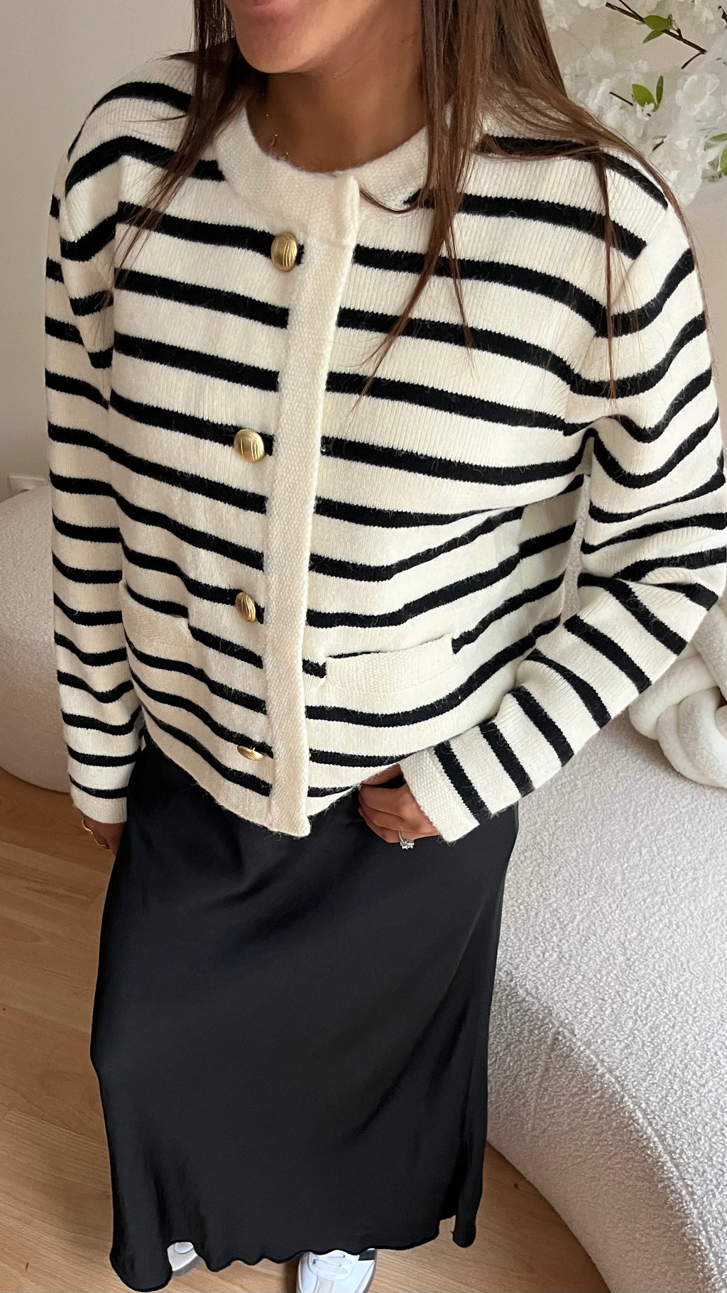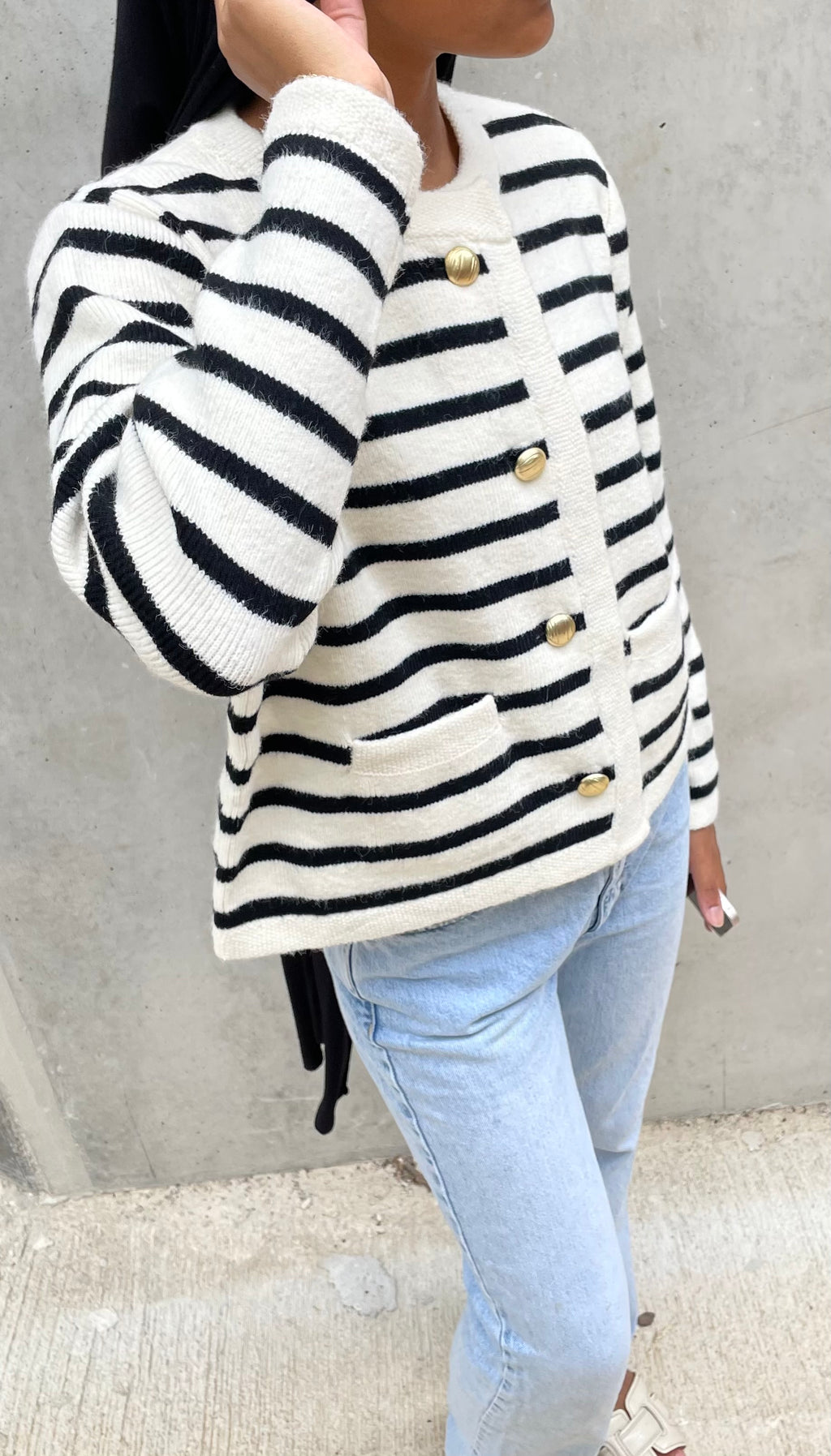 Gilet rayé esprit marin, épais avec boutons dorés texturés. Coupe droite, col rond.
