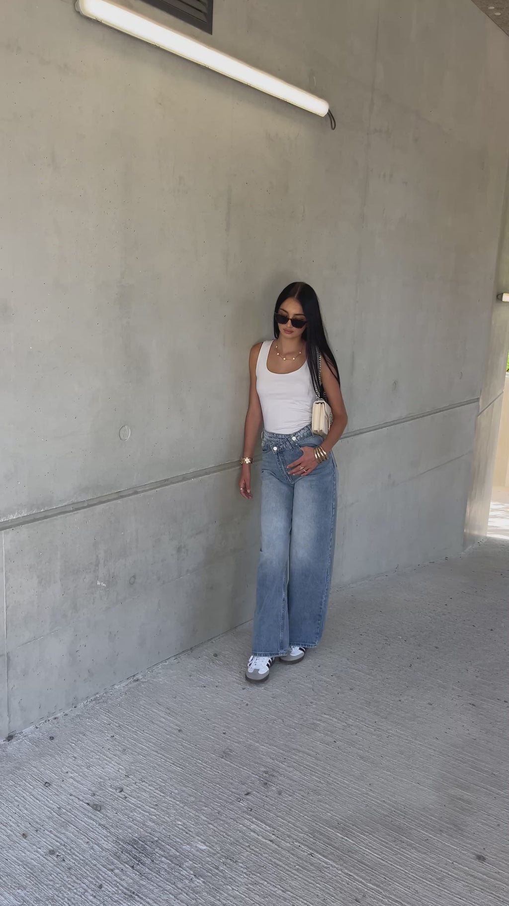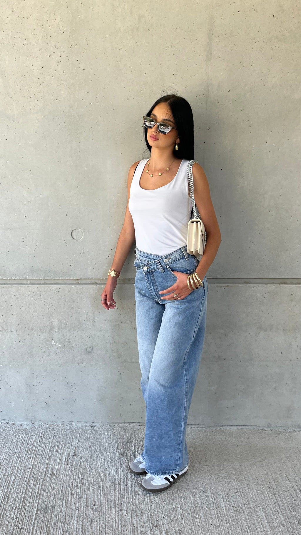 Jean taille haute à coupe droite avec fermeture asymétrique sur l’avant.