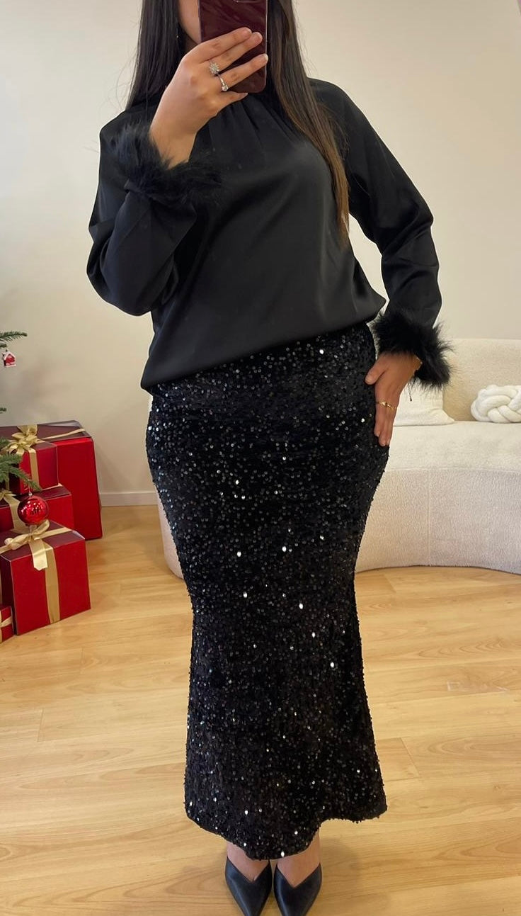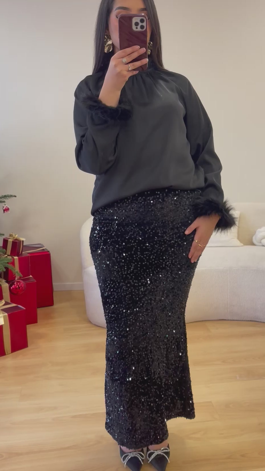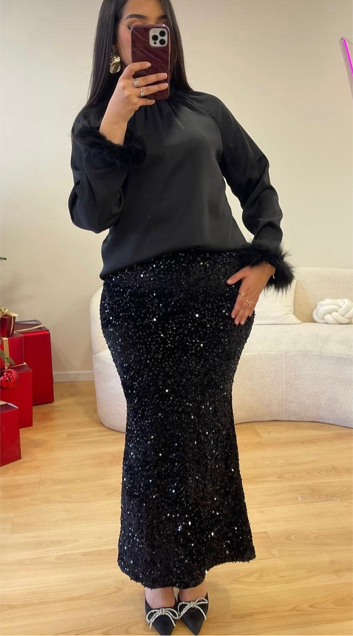 Le modèle porte une taille unique – elle mesure 1m69. La longueur de la jupe est de 106cm.